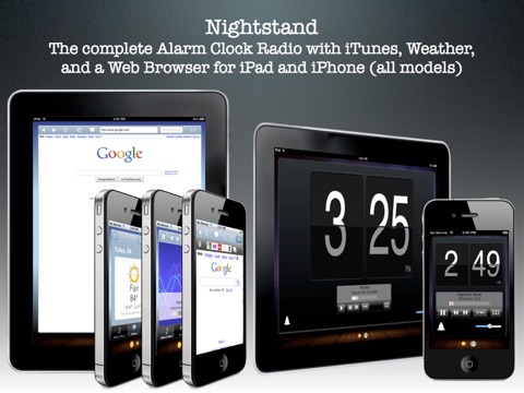 Nightstand is the ultimate alarm clock app for your routine. It uniquely combines a beautiful, fully-functional alarm clock - the app you need right before going to bed - with the things you need right after getting up in the morning, including radio, weather, and news in a full-featured web browser.