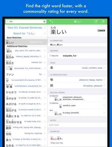 Our dictionary is made to find what youre looking for fast, with the words Japanese speakers actually use at the top of every search result, and every word marked as "common", "uncommon", or "rare".