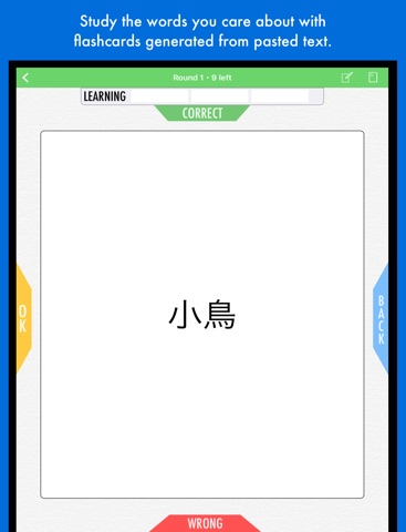 Personal experience (as well as a good deal of research in second-language acquisition) has shown us that the words that youre most likely to remember are the words that youre encountering naturally. To this end Nihongo automatically draws from your search history and clippings to compile flashcard decks filled with words for which you already have context. This makes it easy to study both the words you looked up during Japanese class, and those that appear in your favorite song or videogame. And by adding notes to the back of flashcards you can further connect each vocabulary word to your personal contextual understanding.