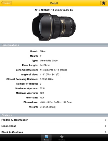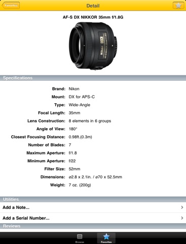 This app allows you to add lenses to a Favorites page so you can keep an inventory of what lenses you own or which lenses you want to have on your wish list. These are separated out by Own It and Wish List.