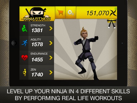 - Gain ninja stars by completing workouts to trade in for harder workouts, outfits, armor, and weapons for your ninja