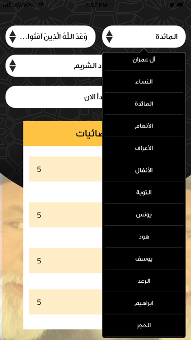 2- يظهر لك احصائيات الآيات التي قرأتها.