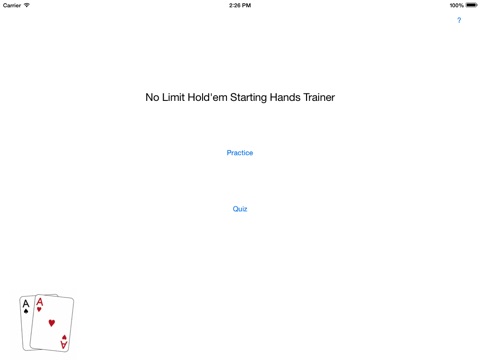 This trainer teaches you which hands to play and how to play them, pre-flop, in no limit hold’em. Choosing the right starting hands will not necessarily make you a great hold’em player, but it is a necessary first step. Learning to fold bad starting hands is necessary to stay out of trouble in no limit hold’em. This app is a good way for beginning Hold’em players to learn when to raise, just call or fold.