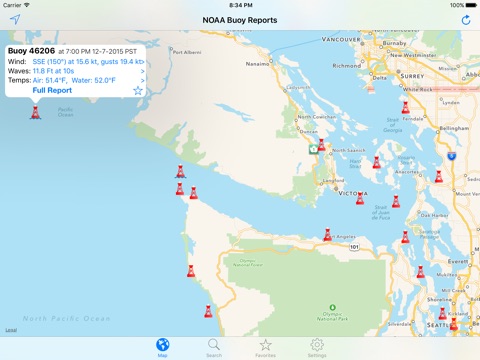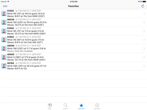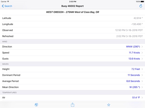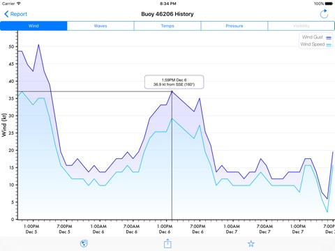 With our intuitive map interface, just tap on any buoy to get its latest reported conditions. A second tap will give you a complete summary of current conditions, or a graph of wind, wave, temperature, or pressure information so you can not only see what its doing now, but what it was doing this morning, or even last week.