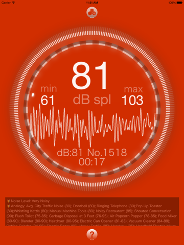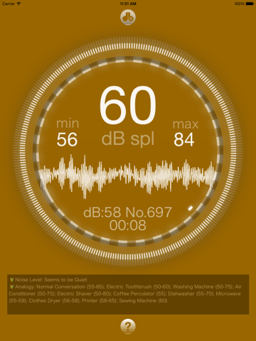 This App uses the flat and friendly design style, precise sampling and computational method, make you can use the microphone sensor of iPhone (or earphone), to survey precisely the noise level of some environment (or object) for a period of time. It may provide the comprehensive careful noise condition information for yours life and the physical and moral integrity. Has it, uses it, you can obtain benefits a great deal!