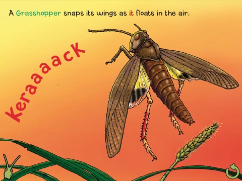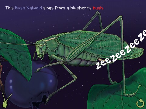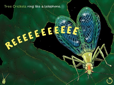* Touch the bugs or jiggle the screen to watch them move their bodies in the way that they produce sounds! Remember, insects do not create sounds through vocal chords, but by moving other body parts.
