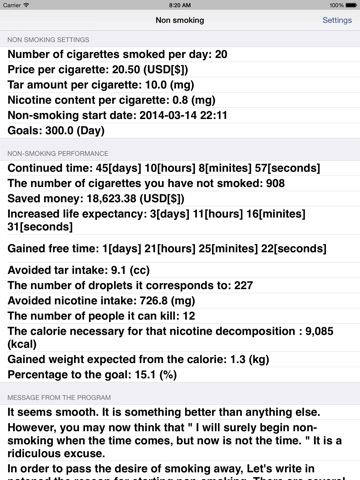 Set the numbre of cigarettes smoked per day, the price of tobacco, currency unit, nicotine, tar, goal, in-application language, the non smoking start date and time, respectively.
