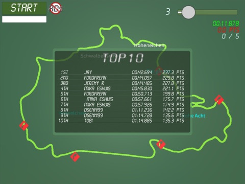 In order to win in each gear level you must drag and place the corner names at the correct locations around the track. Dark corner signs will visualize where on track you may drop the corner names. Grey corner signs means that a corner names has snapped into place. When you are done, click FINISH, and results will appear.