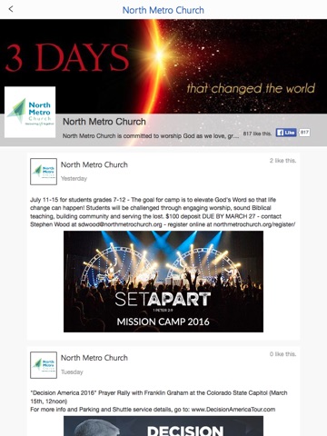 Connect and engage with our community through the North Metro Church app! Discover our media content, give a donation conveniently, or learn more about us.