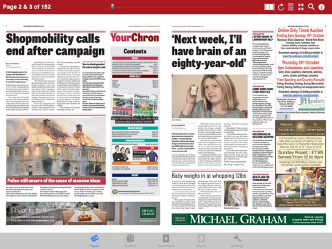 When viewing a paper or supplement, you can pinch and zoom to enlarge the pages and articles, swipe through or jump to the next or other pages, use the search functionality to find specific articles, and view full pages either in single page portrait or double page spread landscape mode.