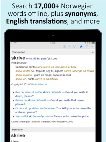 * 17,000+ Norwegian definitions, all available offline! Bonus content available in online mode.