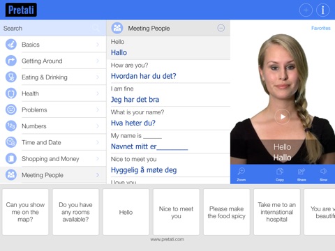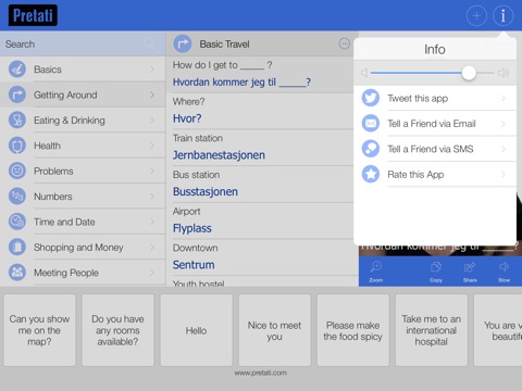 For each phrase, there is a video of a polished Norwegian native speaker clearly pronouncing each word, plus the equivalent Norwegian script and also the phonetic pronunciation of the phrase. For convenience, these handpicked Norwegian phrases are grouped into categories for the most common travel situations including Getting Around, Eating & Drinking, expressions, Health, Problems, Numbers, Time and Date, Meeting People, Shopping, Money and even the necessary Norwegian survival phrases. Other first of their kind features include the ability to playback each Norwegian phrase in slow mode, mark favorites for quick reference and even copy the phrase to send via SMS or email to your friends. You can quickly share these to your social media circles too. While the app is primarily designed to cater towards travellers’ every day translation needs, it is also a great learning tool for those of you who wish to make learning the basics of the Norwegian language an easy, intuitive and fun thing for you and your whole family!