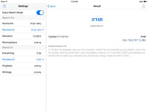 Exact Match — Turning on exact match will increase speed and allow searching strings of up to 24 characters (instead of 8) in the entire Hebrew Bible (i.e. Pentateuch, Prophets and Writings all at once). Turning off exact match will allow searching for every combination of a word and yield much more results. Exact match is automatically disabled when searching for numerical values. Please note that in some cases, when words contain more than 6 letters and exact match is switched off, results can take up to 2 minutes to be displayed.