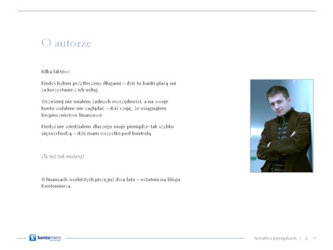 Krzysztof Sobolewski "Notatki o pieniądzach" - Darmowy e-book od Kontomierz.pl. 29 luźno zapisanych stron z najbardziej podstawowymi poradami o oszczędzaniu i budżecie domowym. Szybki start w finansową niezależność i przejęcie kontroli nad swoimi finansami.