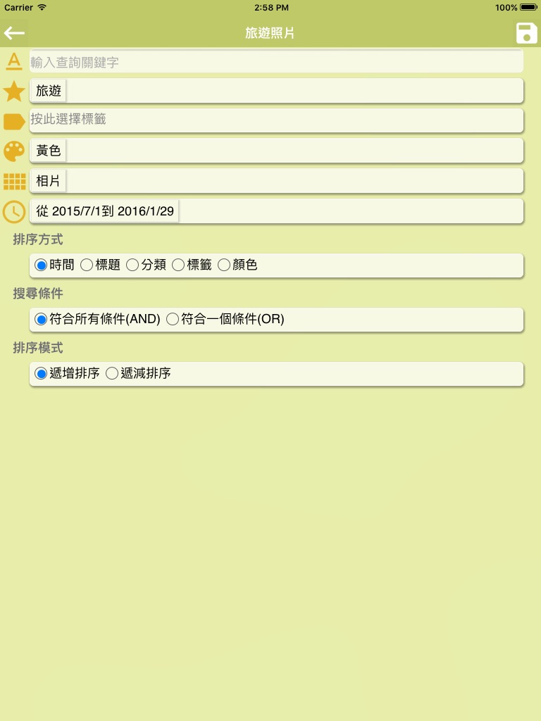 ‧Different sort modes are provided. You can set the sorting order according to time, title, category, tag, and color. Ascending or descending sorting can be set when doing an advanced search.