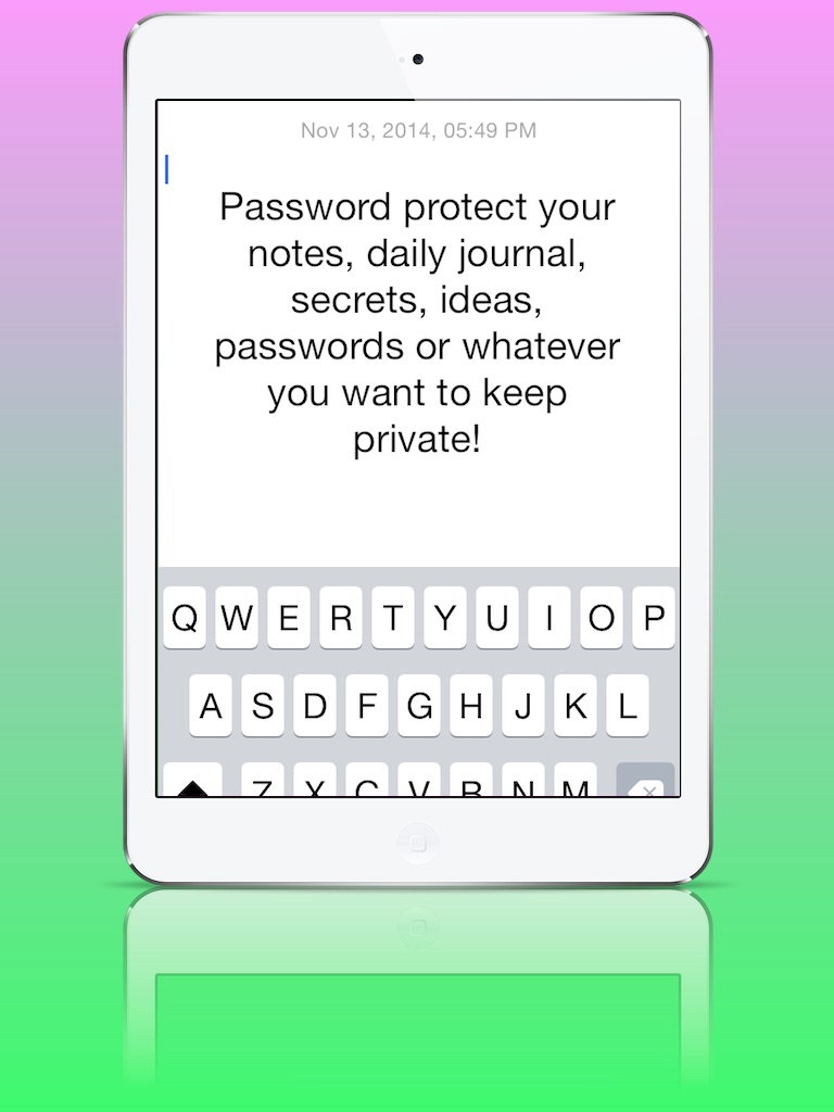 Passord protect your journal, diary, notes, passwords, secrets - whatever you need to keep secure. You can make endless entries to your secure database. You can also create multiple accounts with separate passwords keeping your information secure and organized.