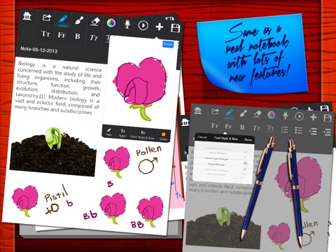 •Drawing pad: not only can you draw and recreate the drawing when you open the note, but you can add shapes with graphs, stickies (un editable text) and different shapes and pictures.
