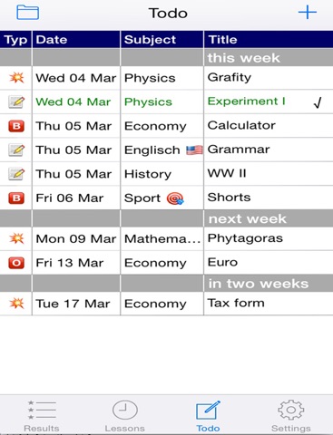 With SchoolResults you have an easy overview over all your grades. You can define your own lessons plan which shows graphically your lessons and to-dos. Add and manage your to-dos easily.