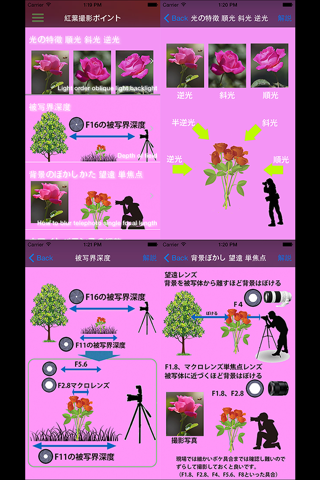 ブローグにて掲載していました写真撮影方法についてアクション(動く)機能を組み込み理解しやすいようにまとめています(自らこのアプリを製作)。