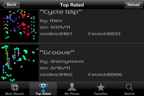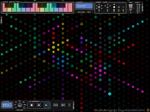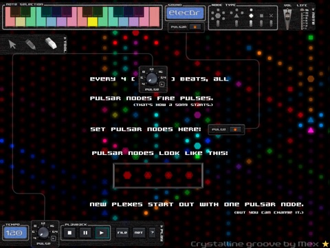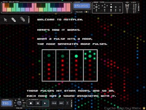 The music happens before your eyes. A plex consists of a network of nodes. Each node has a tone associated with it. When a pulse hits a node, nodes create pulses. The resulting chain reaction creates a noteplex song!