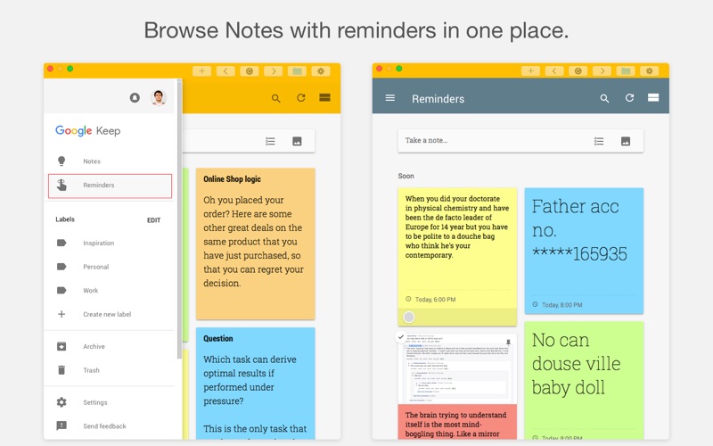 1. Yet another app that bundles the website into a webview. Thanks, but I could have done that with a Chrome plugin, for free :-( 2. The only thing it adds is the possibility to display the notes in the background, in a wallpaper-like form :-| 3. But: hiding the application, using „F12“ or so, also hides the wallpaper-notes :-( 4. The hotkey doesn’t work on El Capitan and the „Open at Login“ doesn’t work as the application can’t be added to the „login item list“ :-( 5. Using the browser shortcuts works, which is not cool as using „CMD + left-arrow-key“ jumps back to the login page :-( This is worth one third of what I paid but definitely not €2.99...
