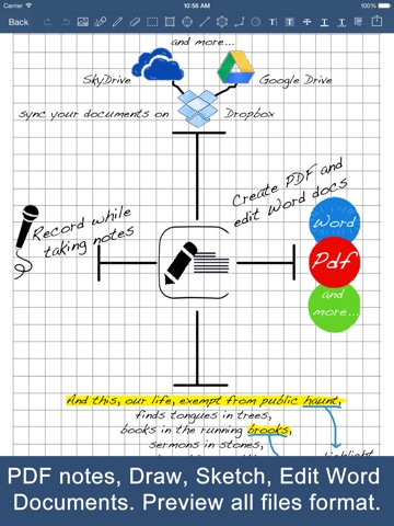 Draw and sketch, make notes on your documents using the stamps, highlighters, sticky notes and more. Create and edit PDF documents. Read and highlight ePub books. Fill in and sign PDF forms that can be imported from Dropbox, Cloud, OneDrive and WiFi. Above all else, you have access to a powerful Word processor. Internal browser is included.