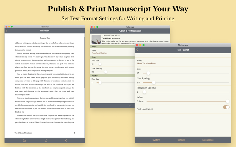 It provides a simple and elegant text formatting interface with style, bullets & lists, indent, align and other functions neatly categorised as separate options in the toolbar. Writers can easily set to standard manuscript format and write a book with just a tap of a button. First line indent, line spacing, font size, etc. are all available at your fingertips.