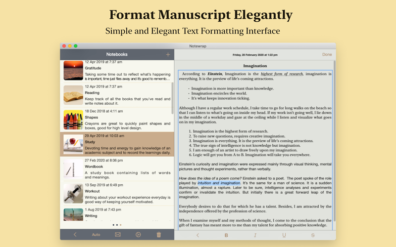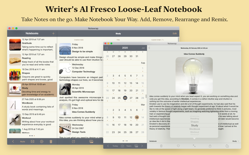 Whether you are a writer writing stories, poems or articles, blogger writing blog-posts, student writing essays, assignments or reports, researcher writing research papers or simply someone who is into journaling and maintains journals such as gratitude, food etc., with Notewrap you can easily create such writings as notebooks your way on the go as it provides a simple and elegant interface and lets you take notes a paragraph, scene or chapter at a time and gives you complete control in the way you want to create and style your writings.