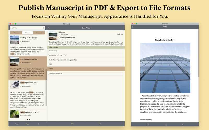 Take notes on the go whenever imagination strikes, add them to a notebook and write a book, blog, essay, report or paper. Write in pieces, one scene, paragraph or chapter at a time and add them to a notebook and later rearrange & remix notes & photos so that e.g. scene 4 can become scene 1 or chapter 7 can become chapter 2. You can also add front matter such as title page, acknowledgement etc. and back matter such as end notes, photos etc. Once your draft is ready you can export your notebook to various formats such as pdf, rtf, plain text, markdown etc. An al fresco writer’s loose-leaf notebook that lets you write a book, blog, essay, report or paper on the go like never before.