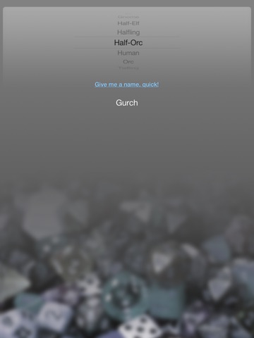 Now, you can rely on NPC Name Gen to spit out random names for you in the blink of an eye, thereby keeping your game on track. Its incredibly easy to use - just select a race, and tap the "Give me a name, quick!" button until you get one you like.