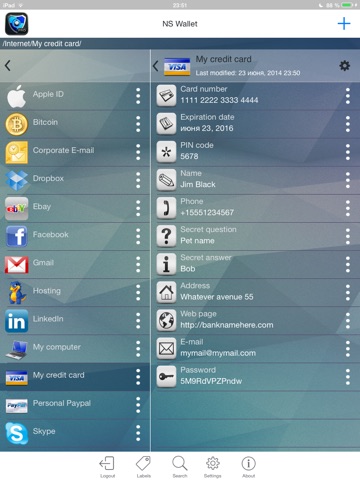 NS Wallet is reliable, secure, multi-platform keeper for your confidential information (like passwords, credit cards numbers, pin codes, phones and etc). Privacy is our highest concern, thats why NS Wallet is fully offline solution, your data is stored ONLY on your iPhone or iPad, the app doesnt use any Clouds and any network communications.