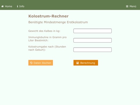Mit Hilfe dieser Rechner haben Sie die Möglichkeit direkt vor Ort und ohne Internetverbindung wichtige Kenndaten für sich oder Ihren Landwirt zu berechnen. Die Berechnung ist einfach und schnell durch Eingabe weniger Werte möglich. Eine Internetverbindung ist nur beim ersten Aufruf zur Aktivierung der App mit Ihren Zugangsdaten zu Nutztierbetrieb.eu notwendig.