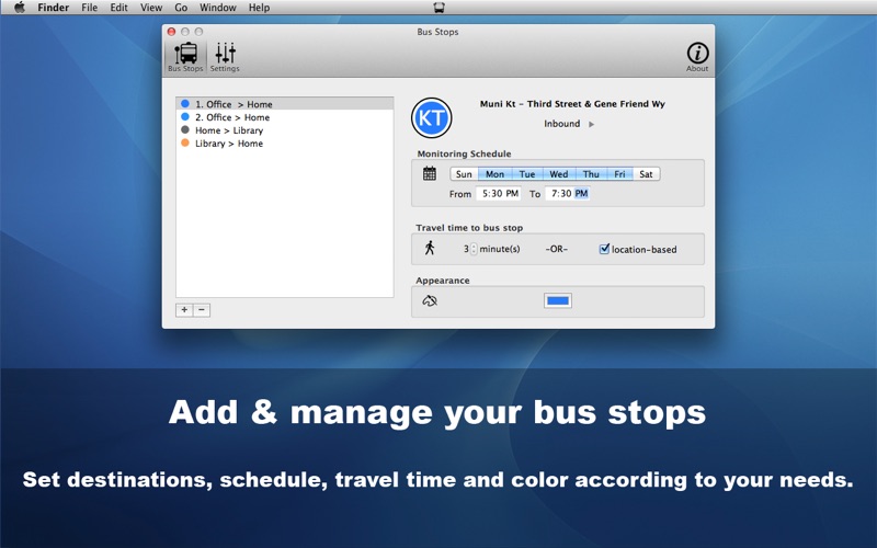 - Every bus stop is assigned a schedule: if you typically leave your office between 5:30pm and 7:30pm Monday through Friday, NudgeMe will keep quiet outside of these hours.