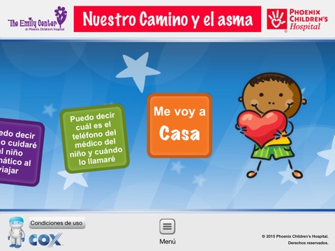 The Emily Center en Phoenix Children’s Hospital presenta Nuestro Camino y el asma para que las familias con niños asmáticos sepan identificar lo que necesitan saber antes de irse del hospital. Partes de esta aplicación podrían utilizarse en las consultas en la clínica y en la sala de emergencia.