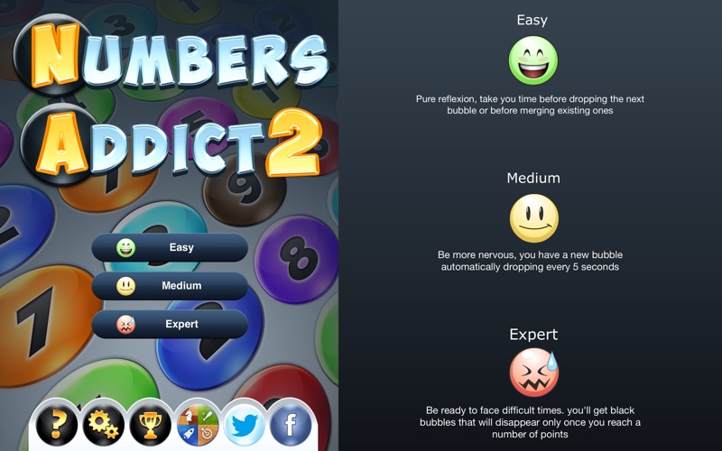 *** What is Numbers Addict ? This is a unique concept for a totally addictive game: bring down the balls, add them, anticipate next ones to reach the best score but also challenge your Facebook friends. For that, you must use your intelligence, your imagination, your reflexes and keep your head cold ! ***