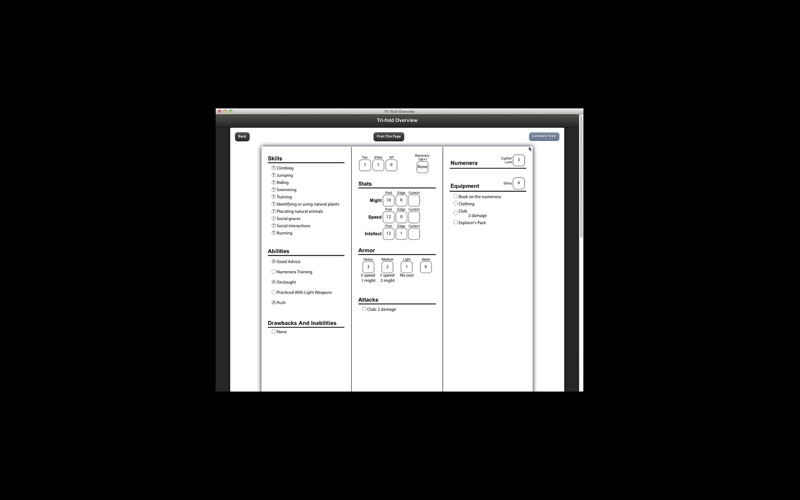 Youll choose a descriptor, type, and focus. Your choices will automatically create your skills and provide you with your starting equipment. Youll modify your basic stats (Might, Speed, and Intellect), and well track your base and your current pool. You can track your damage and recovery rolls, and youll be able to add or remove abilities and equipment.