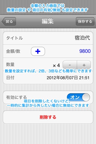 ◆Entry the money or numbers (Title, Money/Numbers, Amount, Date, Enable)