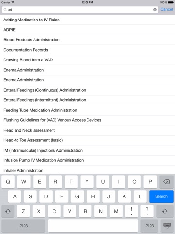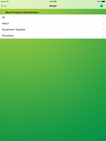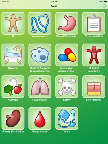 This app allows novice nurses and nursing students to access over 120 skills and procedures separated by topic areas learned through fundamental nursing courses. Once the user selects the skill, they will be presented with equipment they will need to perform the procedure and a step-by-step approach to performing the procedure safely. In addition, users will have access to basic information related to common subject matter learned in fundamentals courses to utilize in the clinical setting. Some of the main features are outlined below: