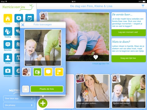 Nutricia voor jou is een vraagbaak en fotoboek in één. De functies in de app passen zich aan jou aan. Ben je zwanger: dan krijg je handige tips en informatie over je zwangerschap. Is je kindje geboren, dan vind je hier antwoord op al je vragen over voeding, groei en de ontwikkeling van je kindje. Met de voedingsschema’s en timer weet je precies wanneer het tijd is voor de volgende voeding, ook als je partner of de oppas voor je kindje zorgt. Alle bijzondere momenten met je kindje leg je eenvoudig vast, om te bewaren en te delen met vrienden en familie.