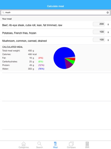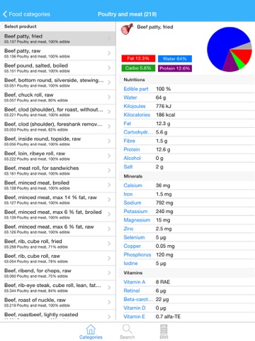 Nutritions database gives you detailed information about the nutrients of over 1300 food products including calories, water, fat, carbohydrate, protein, vitamins and minerals. Searchable database of food products. Also included is a BMI calculator.
