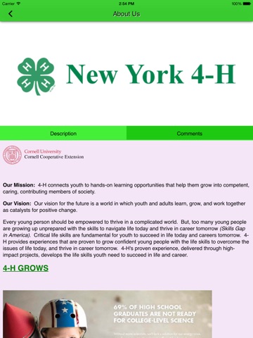 4-H is a youth organization administered by the National Institute of Food and Agriculture of the USDA, with the mission of engaging youth to reach their fullest potential while advancing the field of youth development”. The goal of 4-H is to develop citizenship, leadership, responsibility and life skills of youth through experiential learning programs and a positive youth development approach. Though typically thought of as an agriculturally focused organization as a result of its history, 4-H today focuses on citizenship, healthy living, science, engineering, and technology programs. The 4-H of New York App features: