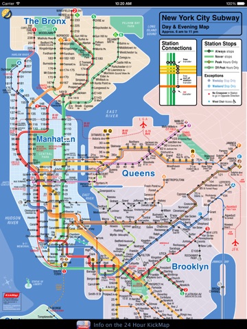 The NYC KickMap Lite is a simple scrollable/zoomable (no internet connection needed) subway map of the New York City subway system. Its the only subway map that shows ALL of the subway lines, stops, and connections so at a glance you know exactly where your train stops - or doesnt stop. Its innovative design has been featured in The New York Times and Time Out New York.