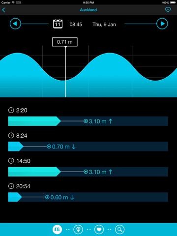 In the app, you will have access to the times and heights of the tides for 177 locations around New Zealand. The tide data is also built in to the app so there is no need to have internet access to get the information you need. That means you can go off the grid and still know pertinent tide information for your chosen location.