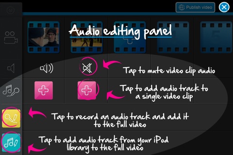 - tap to record audio narration over the whole film project or individual clips. Sound levels will automatically adjust