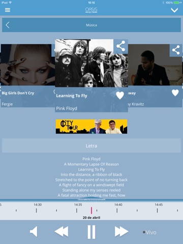 Vive otra experiencia de radio, con la posibilidad de retroceder la transmisión de la radio, leer las últimas noticias y volver a escuchar tus momentos favoritos cuantas veces quieras. Además, tendrás la posibilidad de compartir el momento que estás escuchando con tus amigos en Facebook, Twitter, Whatsapp y Google+