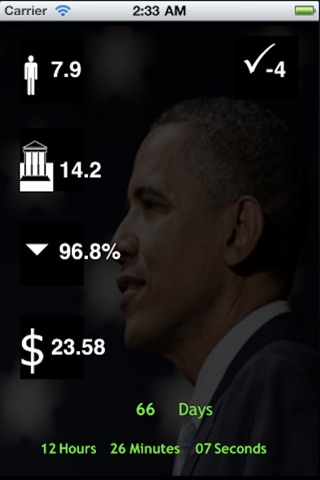 This application is the popular Obama Countdown Clock which show President Barack Obamas second term or his final days as President of the United States. The countdown works in realtime till the Presidents first term ends.