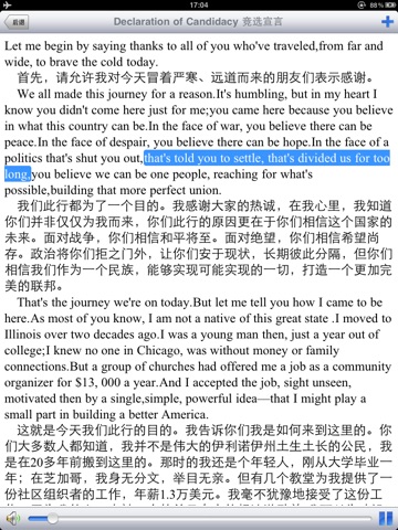 ▲真人朗读▲ ▲同步字幕▲ ▲定位点读▲ ▲英汉对照▲▲内置词典▲▲生词库▲听名人演讲,练听力,学英语,记单词 ▲