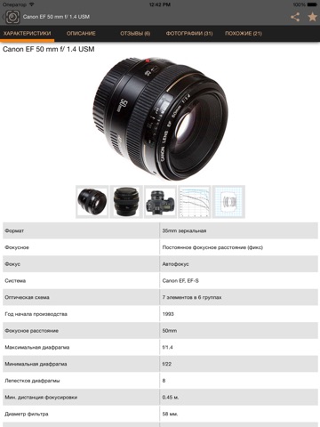 - Подбор похожих объективов (после апгрейда до Pro-версии).