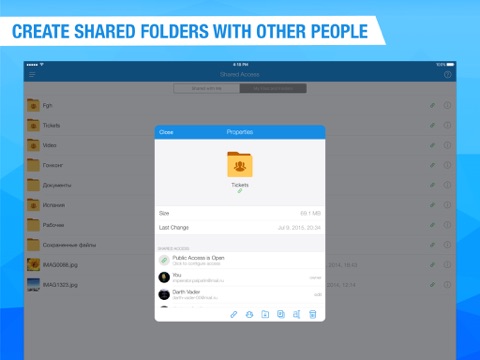 * Create shared folders with other users, add any files together. Use shared folders with friends to collect photos from party or travelling. Work with documents in groups, using shared folder with colleagues. Collect and share family memories - all family members can add photos and videos in a shared album.