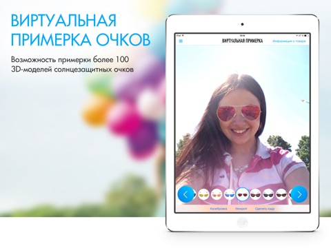 Функция примерки очков в приложении не работает. Очень жаль! Хотелось использовать эту функцию, только ради нее и качал.